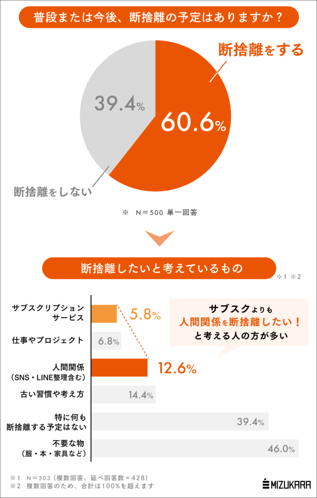 今年の年末年始は約6割が断捨離を予定。サブスクよりも「人間関係」を断捨離したい人が2.2倍多く、人間関係に悩まされている人はそうでない人に比べて現在の幸福度が低いことが判明。