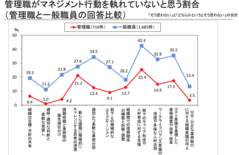 結果は全ての項目で、管理職よりも一般職の方が、「管理職がマネジメントできていない」と答えた割合が上回りました。