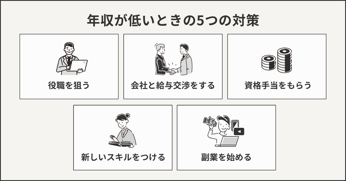 この記事では、年収が低いと感じた場合にできる対策について解説しました。