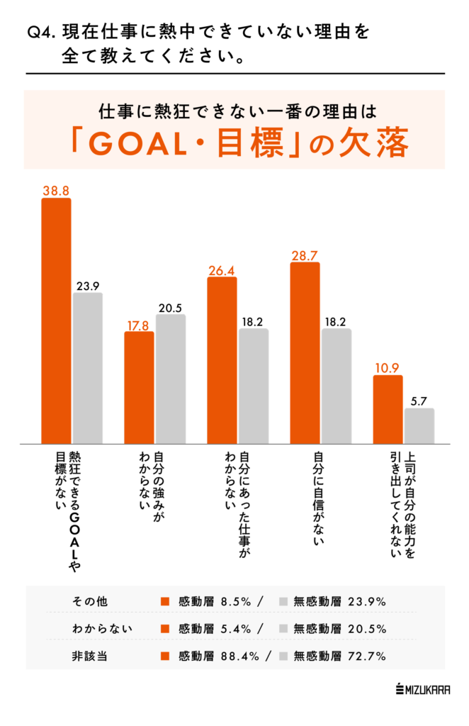 さらに上記質問で「仕事に熱狂していない」と回答した人に対して、その理由を聞いてみました。最も多かった回答は「熱狂できるGOALや目標がない」で、甲子園感動層で38.8%、無感動層は23.9%となりました。