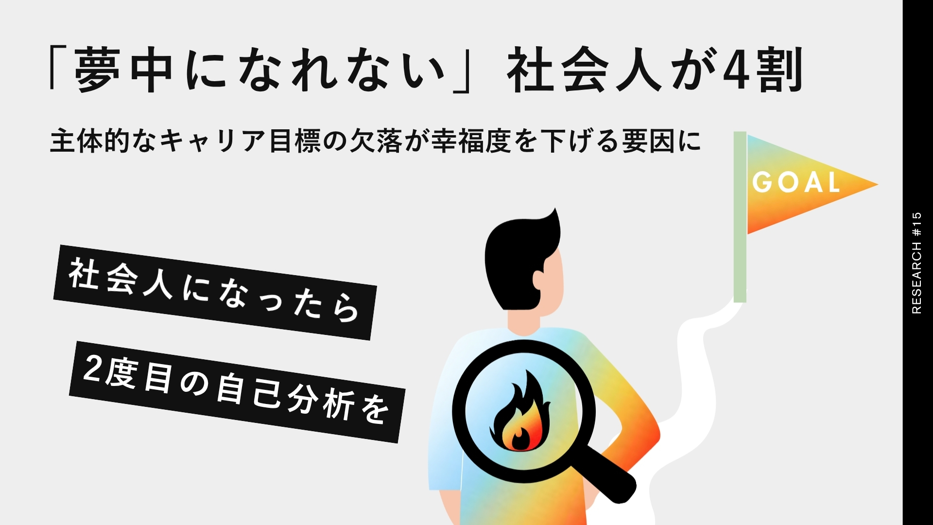 厳しい就職活動を乗り越えると、いよいよ社会人生活がはじまります。今までの勉強の成果を存分に発揮してがんばるぞ!と意気込むのもいいのですが、ここで一呼吸。冒頭の調査結果を思い出してみてください。「目標」を見失って仕事に夢中になれないという”10人に4人”に入らないよう、改めて自己分析をやってみてはいかがでしょう?