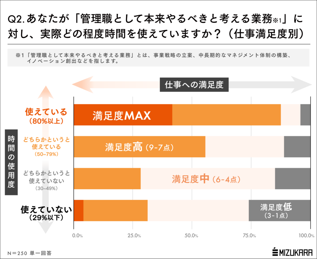 調査の結果、一日の時間の使い方で事業戦略の立案など「管理職が本来やるべき職務」に時間をあてられている人ほど仕事満足度も高い傾向が確認できました。特に80%以上を使えている人は5人に2人(41.7%)が10段階評価で満点の「10」と回答。管理職、といいながら責任ばかり押し付けられて現場のフォローに飛び回る日々が、管理職の仕事のやりがいを奪っているようです。