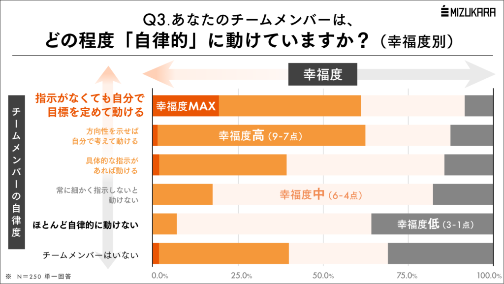 最後に「チームメンバーの自律度合い」と管理職の幸福度のクロス分析をみてみましょう。結果は明白でメンバーが自律的に考えて行動できるチームの管理職は幸福度が高く、反対に手取り足取り教えないと動けないチームの管理職は幸福度が低い傾向が明らかになりました。また「チームメンバーのいない管理職」の幸福度はある程度高いことから、自律的に動けないメンバーを持つくらいなら、一人で全部やったほうが幸せに働けることもわかります。