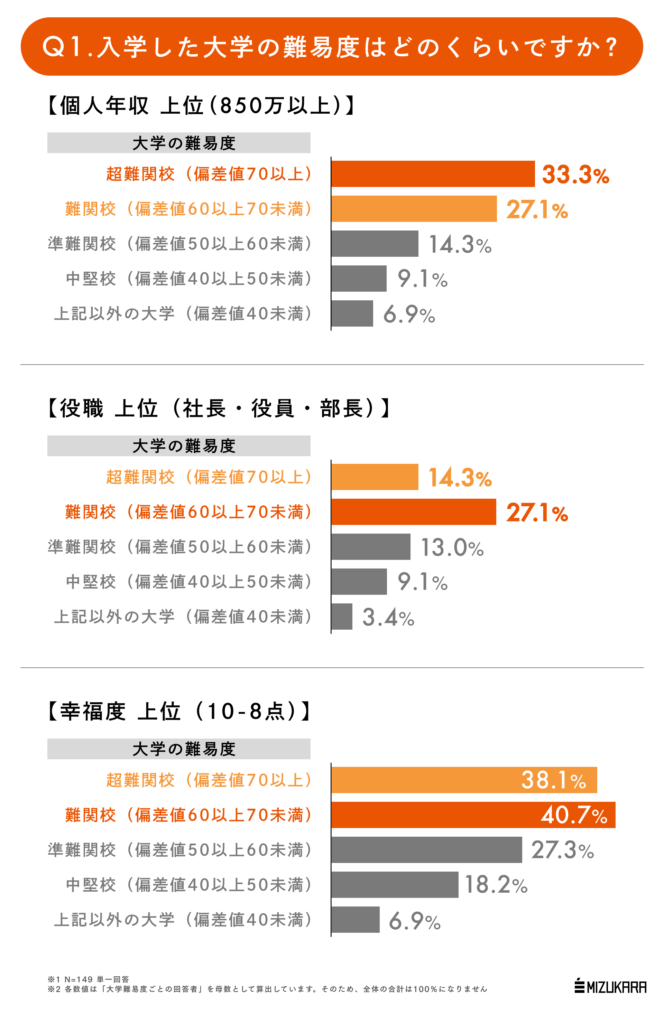 調査の結果、大学の難易度と個人年収や社会的地位、幸福度には一定の相関があることが確認できました。受験追い込みの「今」のもうひと踏ん張りは、決して無駄にはなりません。ただこれはあくまで傾向値として捉えるべきデータであり、大学の難易度で人生が決まるわけではありません。「超難関校」と「難関校」では役職や幸福度は逆転しているなど、必ずしも無理して難易度の高い大学を目指すこと=正解とは言い切れないようです。