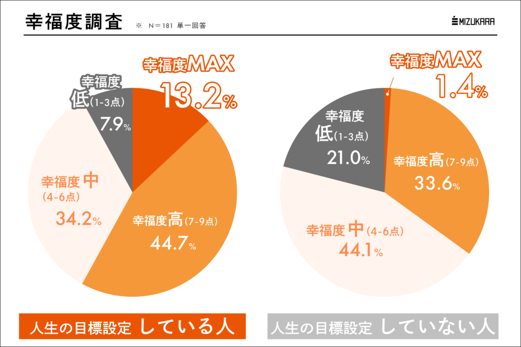 そこで、人々の「目標設定」に関する実態を明らかにすべく、株式会社ミズカラは25歳~59歳の働く男女500名を対象とした「仕事・人生の目標設定と幸福度の相関」に関する意識・実態調査を行いました。