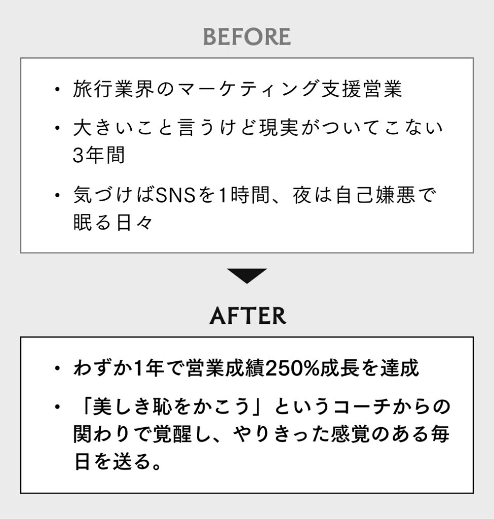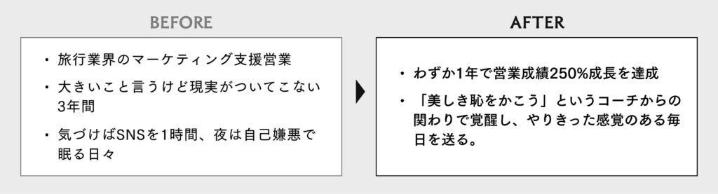定量的な話で言うと、営業成績は、昨年度から対比で250%の成長とか。あとは結構会社的な視点でもう少し採用活動に力を自分から入れていたりとか、違う事業部のリーダーさんに、今回山本コーチに向き合っていただいたノウハウを元にコーチングを自らするとか。