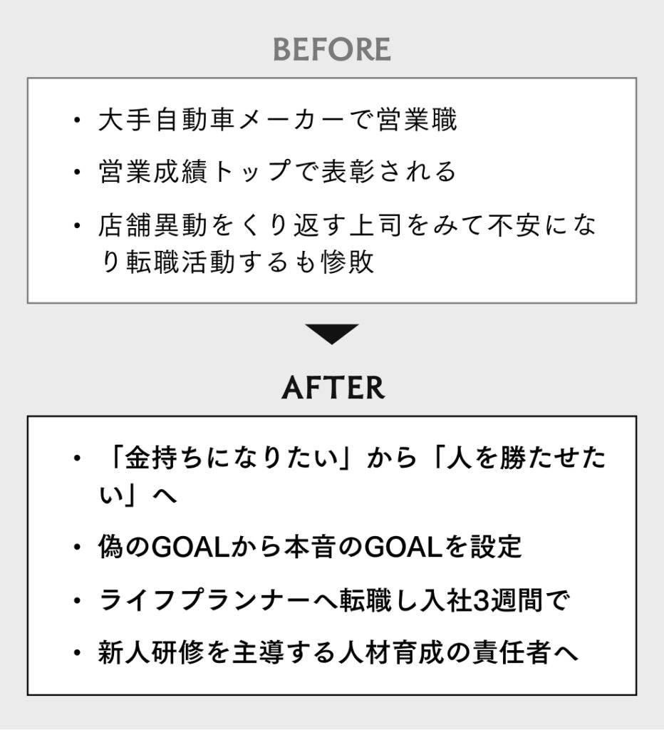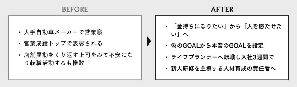 そして、どのように「金持ちになりたい」という表面的なGOALから「保険業界の変革者」という本音のGOALを見つけ、わずか4ヶ月で人生を180度変える転職を実現したのか。