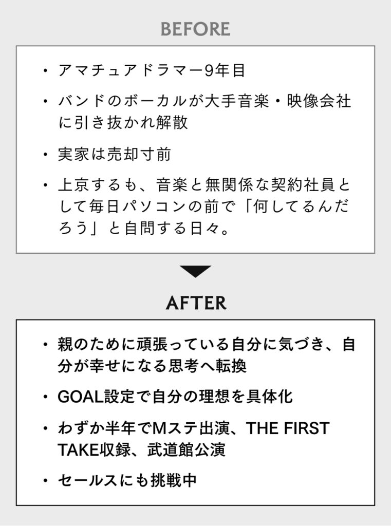 最初は、音楽と仕事を両立させて年収2億円稼いで、リーダーになるというGOAL設定をしました。でもこのGOALに進もうと頑張っていても、実際は家族の族の状況は変わらないし、まだ助けられていないということもあり、家族をどうしたら助けられるかなと毎日考えて、すごく顔が疲れていた時があって。