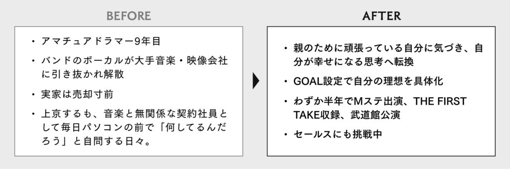 自社のサービスを受けて、いまだに印象に残っているのって、無料体験コーチングの「人生変わりそう」みたいな感覚なので。それは自分の定性GOALである「可能性を広げるきっかけになる」というところにも繋がってそうですし、音楽をやっていることで、他の人より体現者として誰よりも自信がある。