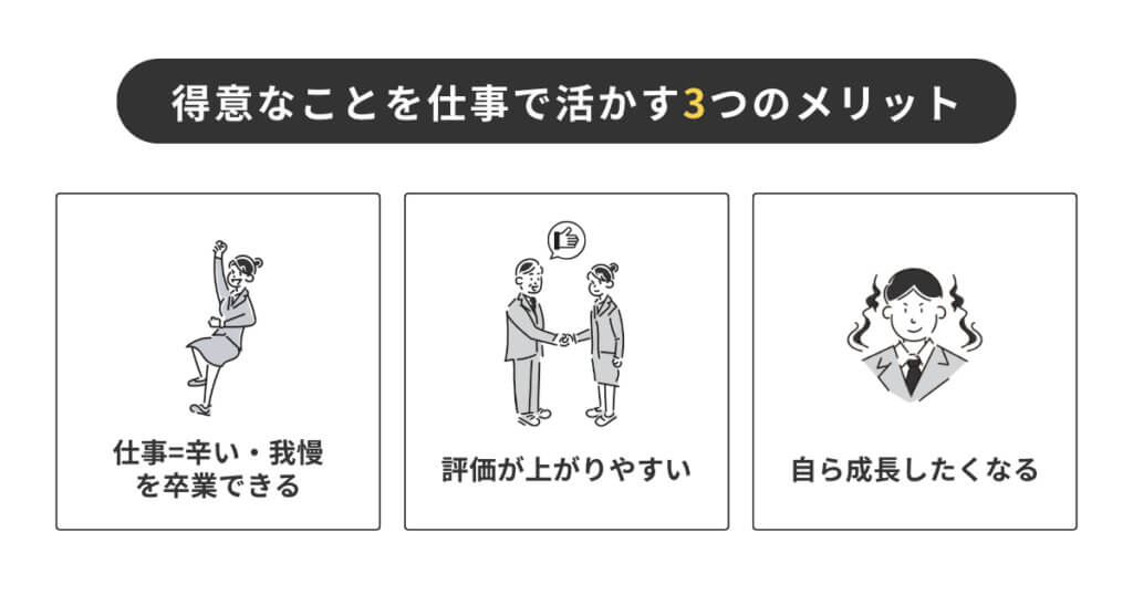 得意を活かすことで、1ステップ上の業務に取り組めたり、活躍の場が広がったりと、好循環を得られます。